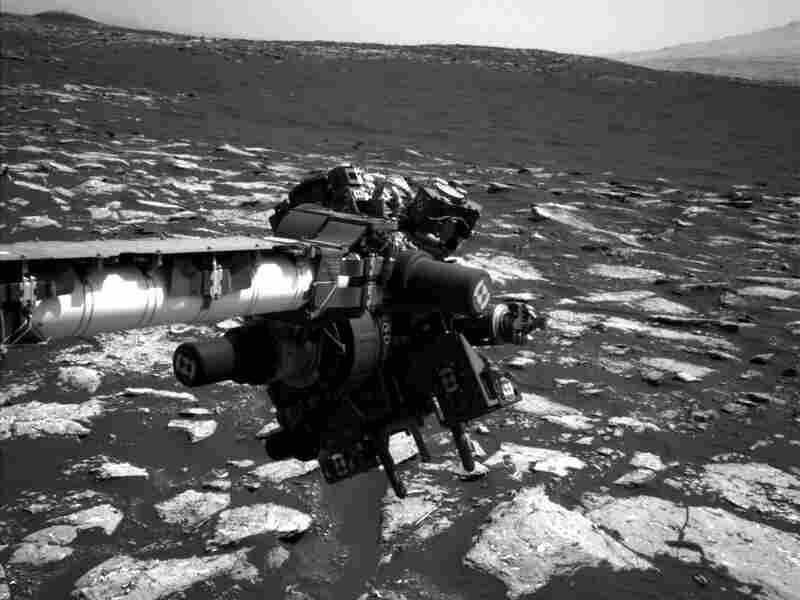 That is the Curiosity rover's robotic arm, which has gotten caught, endangering its scientific mission.